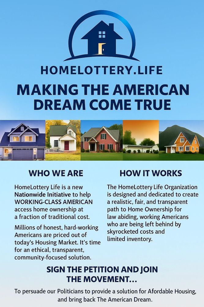 Become part of our vibrant community of homelottery.life supporters. SIGN THE PETITION WITH YOUR NAME, EMAIL ADDRESS, AND STATE, AT: homes@homelottery.life